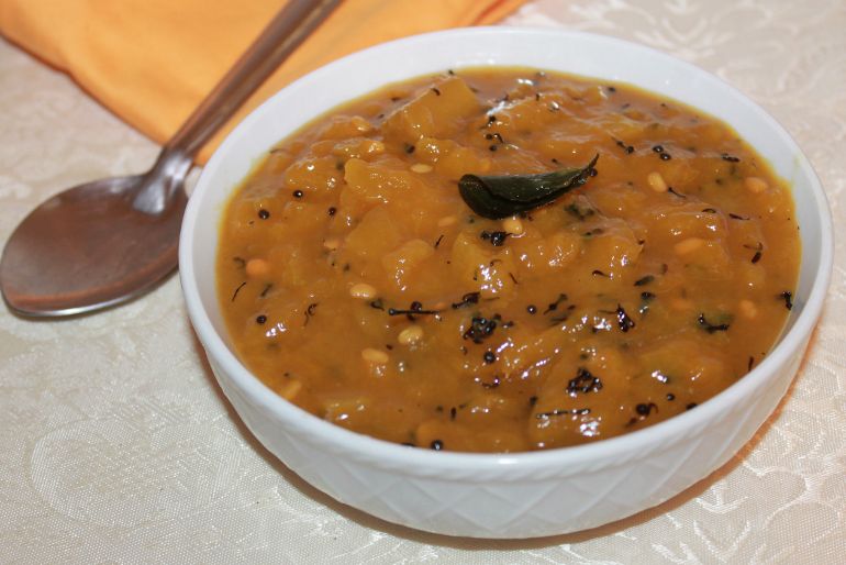 Pulusu is a tamarind-based, spicy, and tangy stew. This stew is made by simmering vegetables like pumpkin, okra, and drumsticks in tamarind pulp with jaggery, special spices, and chillies. Pulusu has a distinct sweet-sour-spicy flavor and is thinner than sambar.